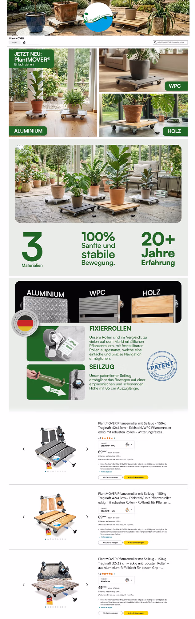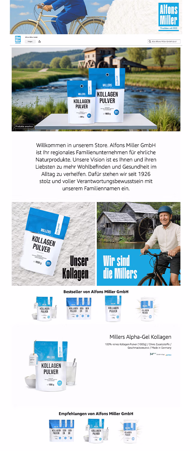 Transformation eines standardisierten Amazon Brand Stores in eine visuell starke Markenwelt, die Differenzierung schafft und die Markenwahrnehmung deutlich erhöht.